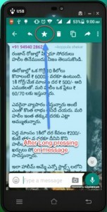 Step 1: Long press on which you want to save in starred message > now press on star, its shows in top up of the window